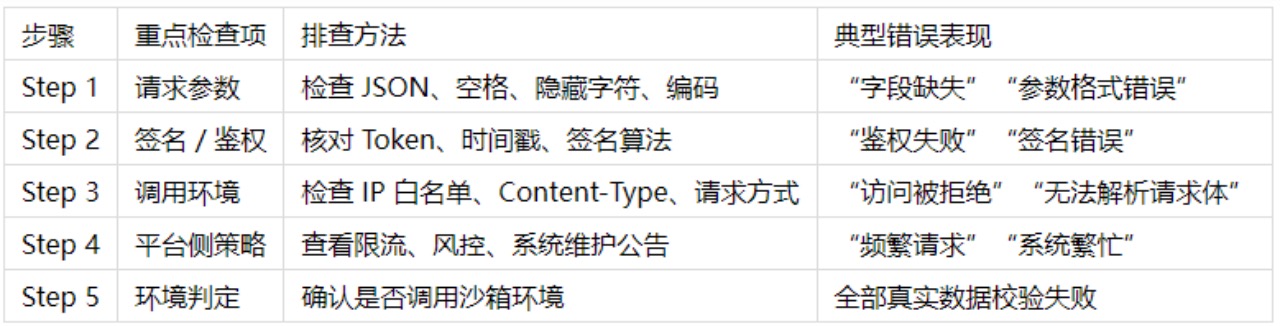 另一个常见问题是:沙箱环境要求的字段格式往往比生产环境更严格,尤其是签名、字段长度、格式校验部分,稍有不符就会失败。