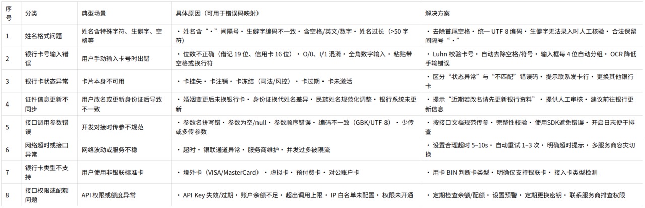 返回明确的错误码,区分"信息不匹配"和"卡状态异常";提示用户联系发卡银行确认卡片状态;引导用户更换其他银行卡。