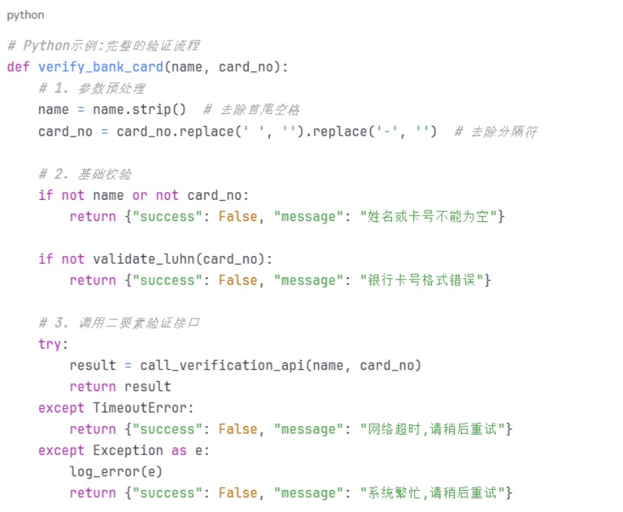 接口调用前使用Luhn算法进行卡号校验;自动去除卡号中的空格、横线等分隔符;前端输入时自动格式化(每4位一组);提供OCR识别功能减少手动输入错误。