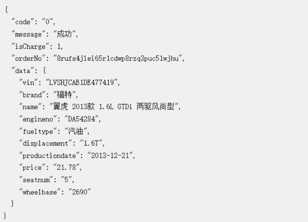 接口调用成功时会返回JSON格式的响应。响应外层包含code(错误码,"0"表示成功)、message(描述信息)、isCharge(是否计费)和orderNo(流水号)。真正的车辆信息在data对象中,包含品牌、车型、发动机号、排量、车身结构、生产日期、指导价格等详细参数。